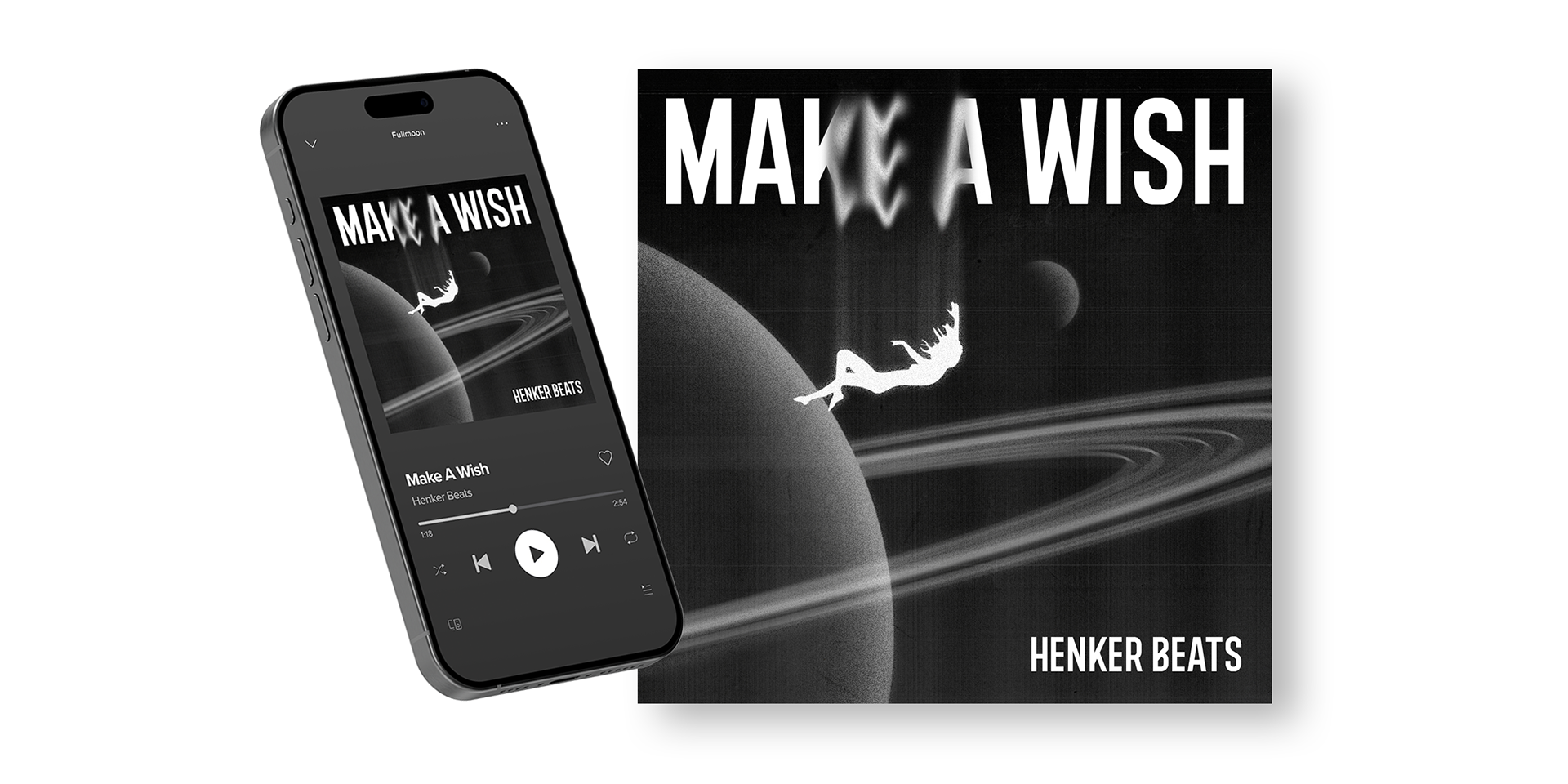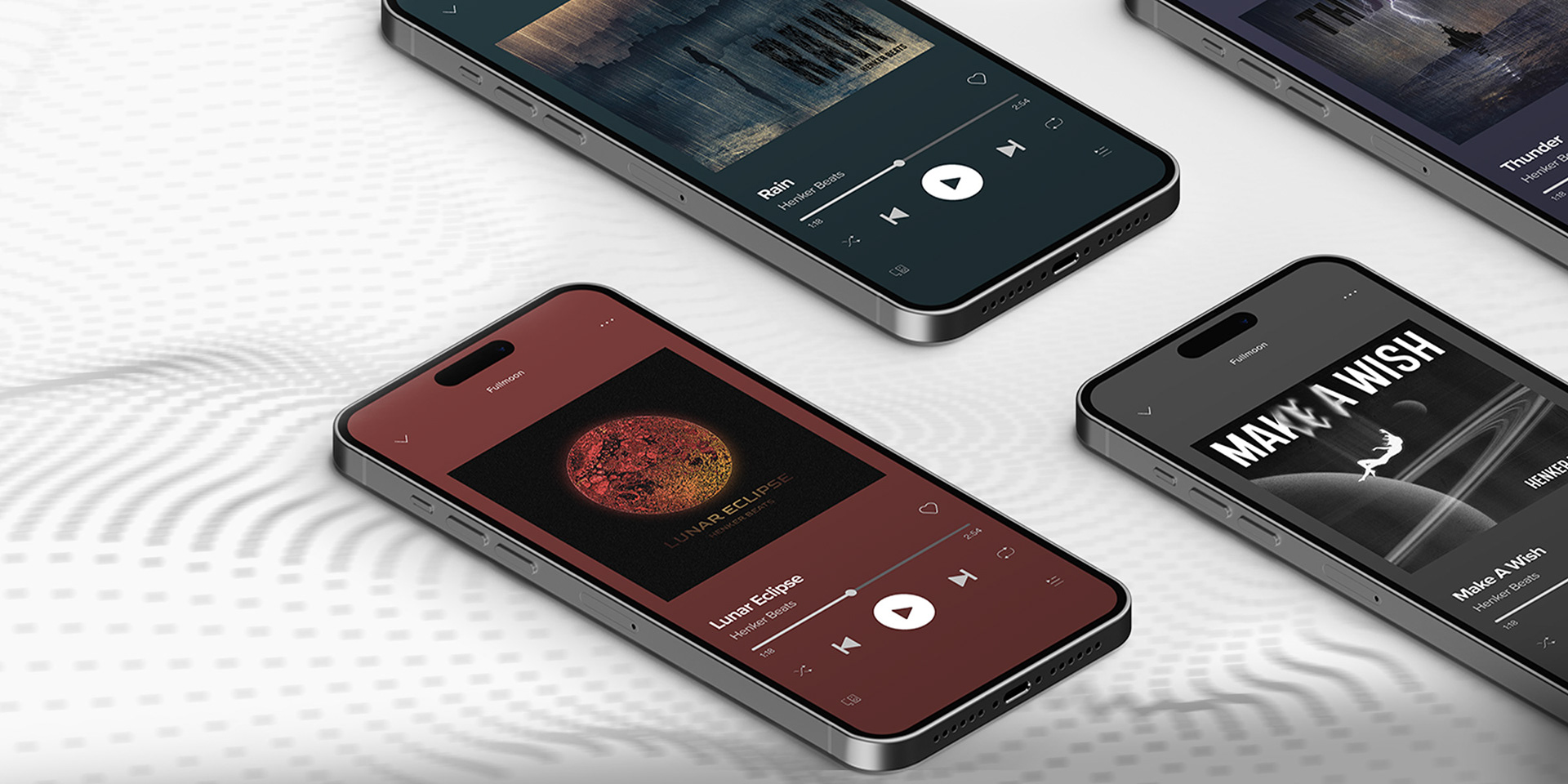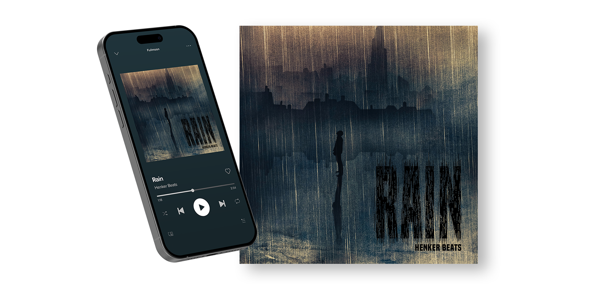 A series of cover artworks for musician Henker Beats. Each design visualizes the track’s mood, from the fiery textures of Lunar Eclipse to the stormy atmosphere of Thunder, the melancholic urban Rain, and the dreamy cosmic Make a Wish.