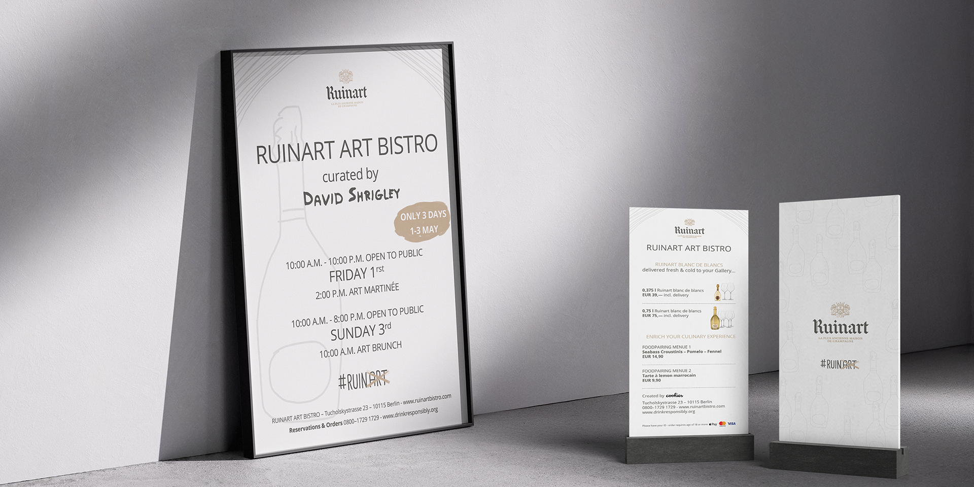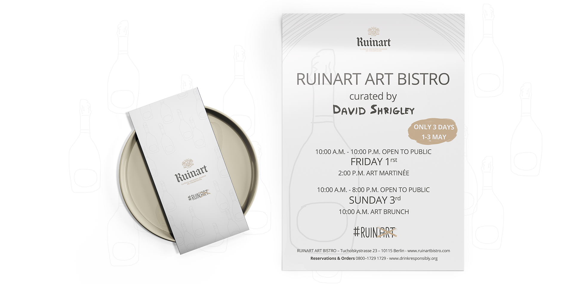 Minimalistic yet artistic branding for the Ruinart Art Bistro featuring David Shrigley. The poster and menu designs blend his playful art style with Ruinart’s timeless elegance.