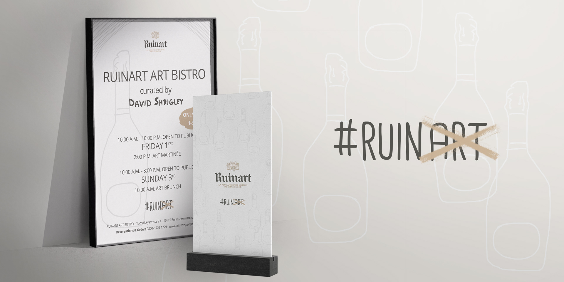 A compact branding project for the Ruinart Art Bistro curated by David Shrigley. Poster and menu designs reflect his distinctive art style in a minimalistic way, balanced with the elegance and sophistication of Ruinart.