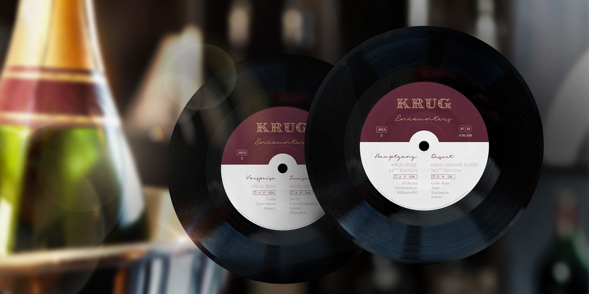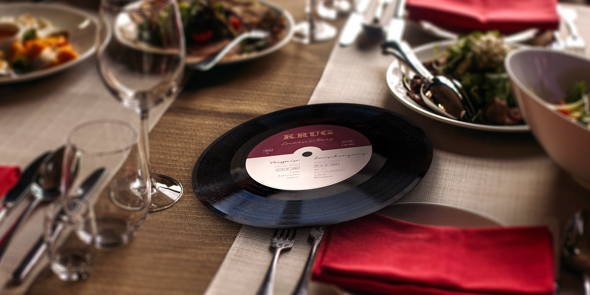 For the exclusive dinner event Krug Encounters, the menu was designed as a vinyl record. The concept connects fine dining and music culture, combining refined typography and deep tones to reflect Krug’s heritage and innovative spirit.