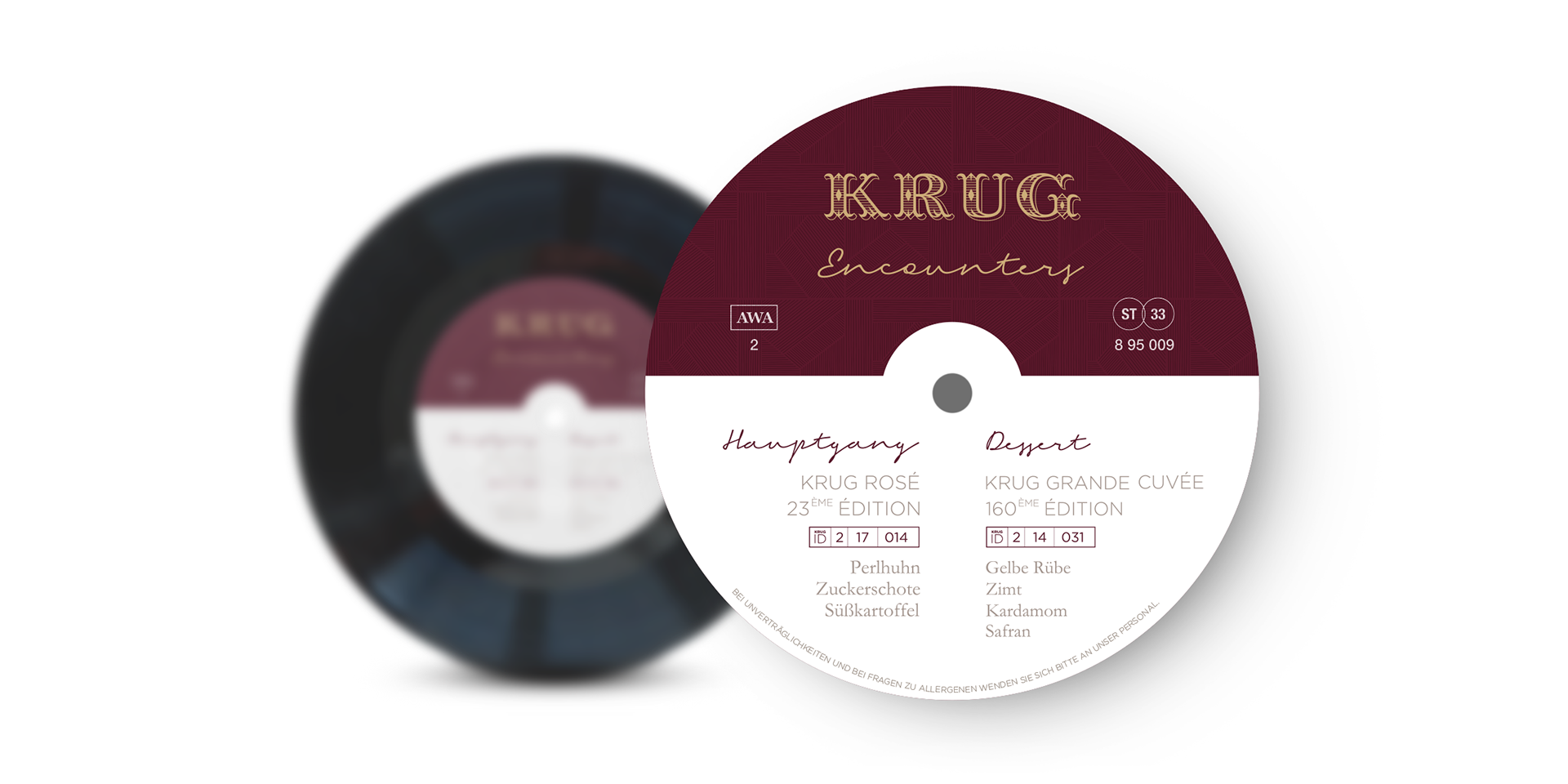 Special menu concept for Krug Encounters, inspired by music and fine dining. The vinyl-record design merges sensory experience with Krug’s refined aesthetic.