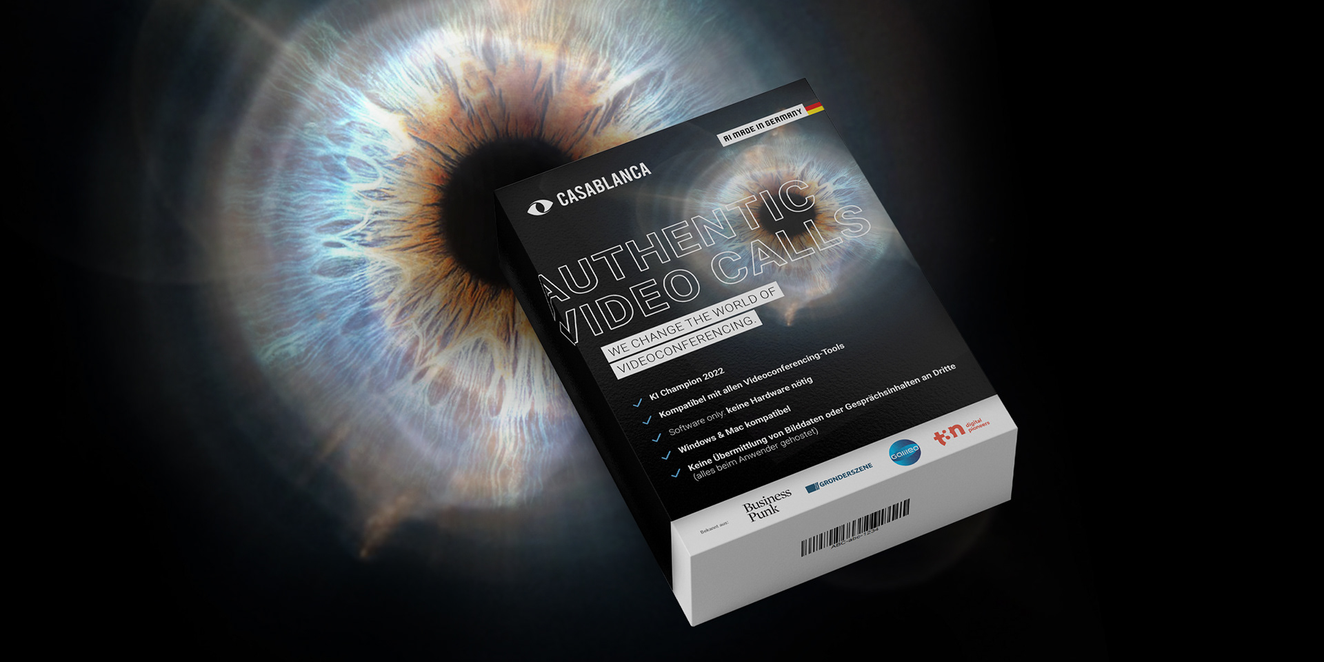 Packaging for an AI-based video software that restores real eye contact. The iris motif symbolizes authenticity and connection in a modern tech context.