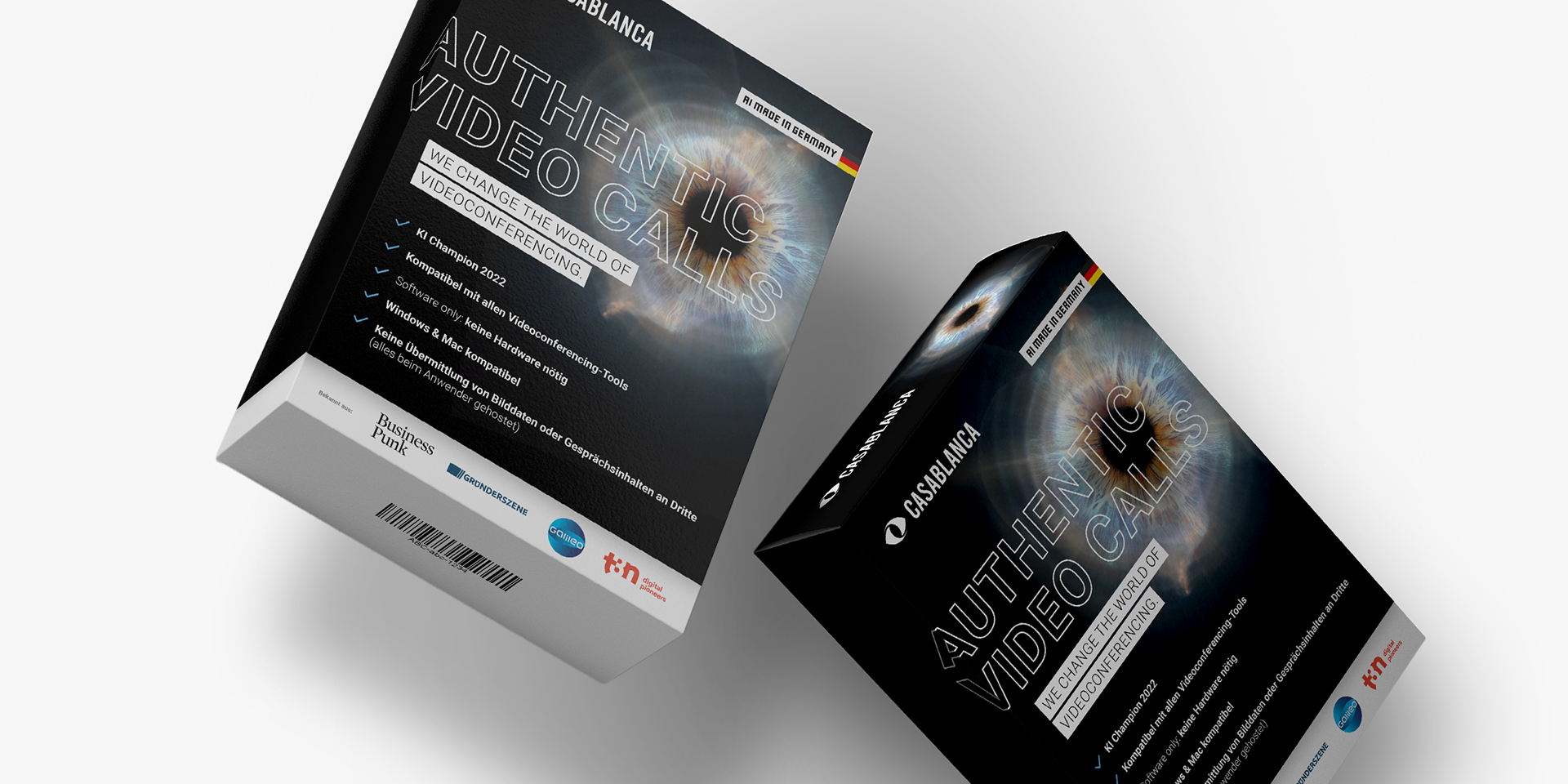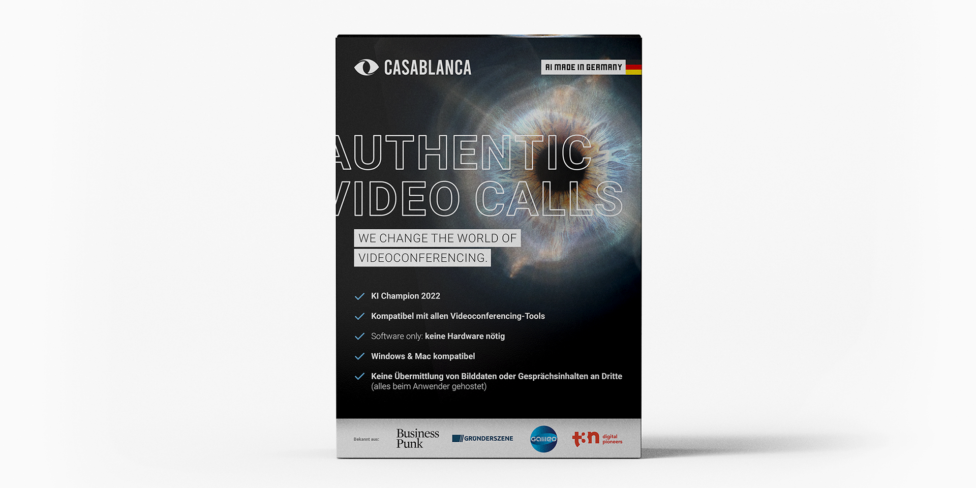 A packaging concept for Casablanca’s AI-powered software that brings back authentic eye contact in video calls. The design combines a striking iris visual with bold typography to emphasize trust, authenticity, and innovation, while balancing human-centered design with tech-forward aesthetics. Created for a privacy-conscious, tech-savvy audience, the packaging reflects Casablanca’s mission to bridge the gap between human connection and artificial intelligence.
